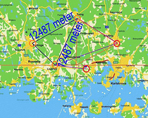 Om man emellertid kontrollmäter med Google Earth, visar det sig att man skulle behöva flytta det norra hörnet i triangeln till ett ställe i västra Blekinge för att få två lika långa sidor i triangeln.