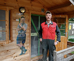 Han har specialiserat sig på just sparris och han kallar till och med gården för Bond-gården och gårdsbutikens platskassar pryder hans person i en pose precis som James Bond. Pistolen är dock utbytt mot en gurka.
