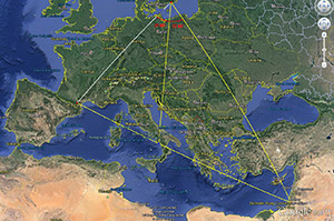 Nu har jag också upptäckt några lite mindre trianglar som VERKLIGEN är liksidiga och som också är förbundna med Björketorpsmonumentet. Det visar sig nämligen att avstånden mellan bautastenarna i Tving och Kallinge och mellan samma sten i Tving och monumentet i Björketorp är exakt lika stora! Som visas i följande illustration får man 12487 meter för bägge avstånd om man kontrollmäter i Google Earth!