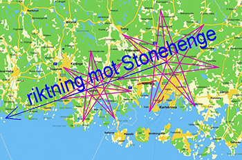 Som jag nämnt i flera artiklar så definieras två sju-uddiga stjärnor av runstenarna/bautastenarna i Björketorp, Nättraby, Rödeby och Tving. Med anledning av TV-programmen om Stonehenge, som nyligen sänts på SVT, ville jag undersöka om det fanns något samband också mellan Stonehenge och våra blekingska geometriska fornminnesstrukturer. Jag drog då en linje från Stonehenge till Björketorpsmonumentet i Google Earth och fann att denna linjen har bäringen 56,97 grader. Därefter drog jag en linje Stonehenge-Rödebystenen. Det visade sig då att denna linje har samma bäring!!! Särskilt om man drar linjen från Stonehenge till den södra av de två Rödebystenarna, ser man att denna linje passerar över eller mycket nära Björketorpsmonumentet! Detta betyder alltså att de två mest framträdande sju-uddiga stjärnorna i den blekingska fornminnesgeometrin pekar rakt mot Stonehenge!